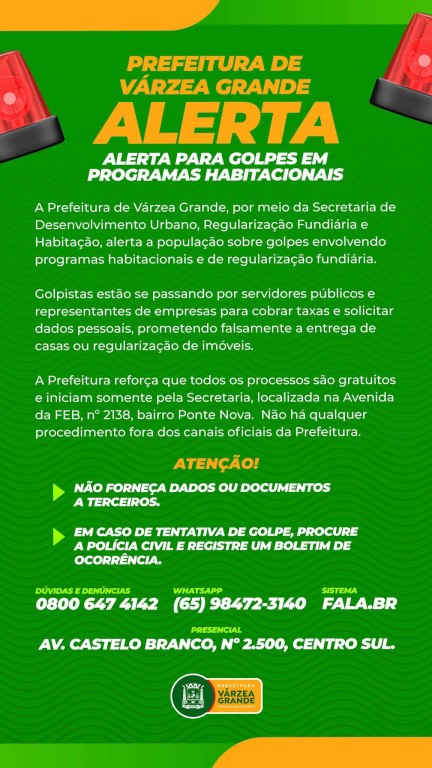 Os criminosos abordam as vítimas por ligações, mensagens, WhatsApp e até presencialmente, cobrando taxas e solicitando dados pessoais ou documentos A Prefeitura de Várzea Grande,