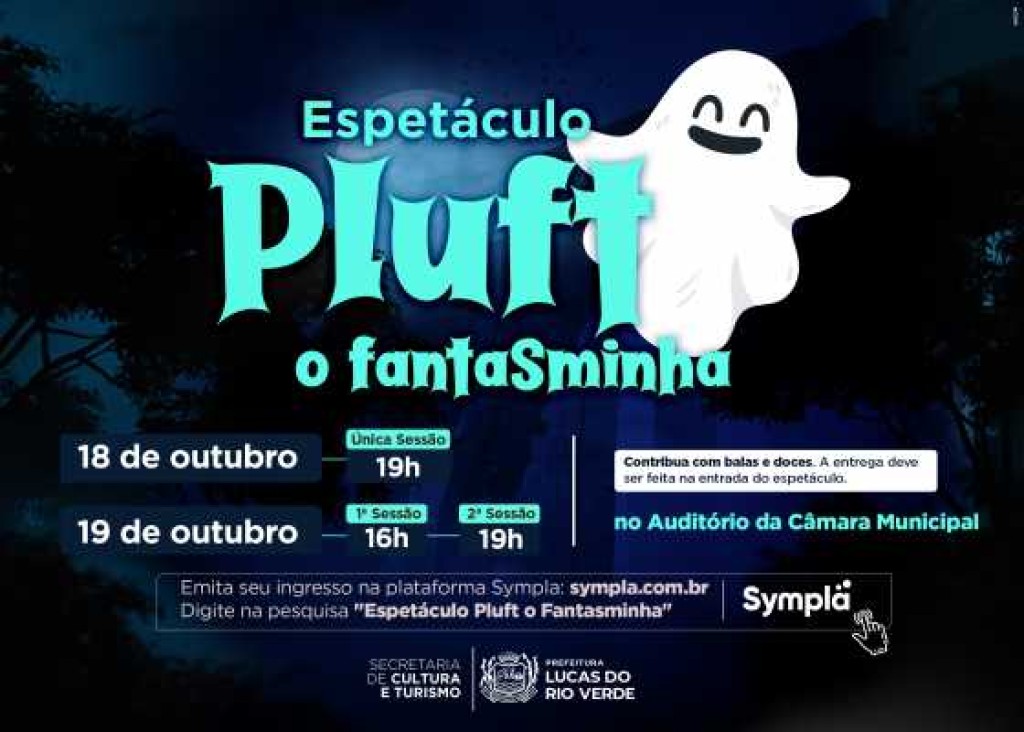 A Prefeitura de Lucas do Rio Verde, por meio da Secretaria de Cultura e Turismo, apresenta, nos dias 18 e 19 de outubro, sexta-feira e sábado, a peça teatral “Pluft, o fantasminha”. Gratuitas e abertas a população, as apresentações acontecem no Auditório da Câmara de Vereadores.
