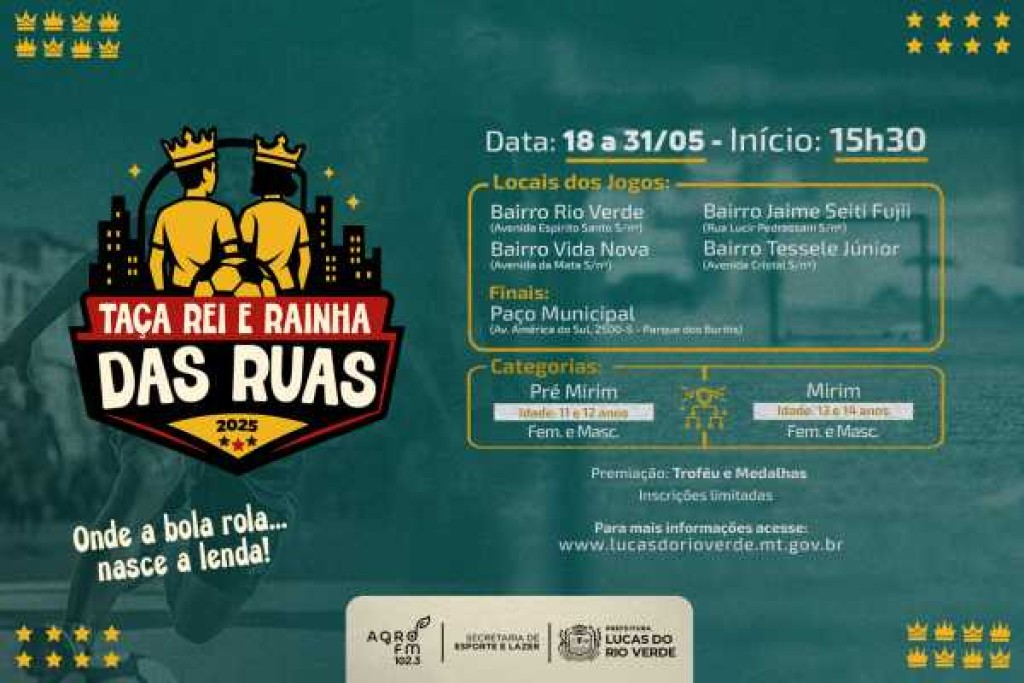 Estarão abertas, a partir do dia 16 até 23 de abril, as inscrições para a Taça Rei e Rainha das Ruas, edição 2025, em Lucas do Rio Verde. Os interessados devem procurar a Secretaria de Esporte e Lazer (Avenida América do Sul, 2500 S, bairro Parque dos Buritis – Paço Municipal) para efetivar a participação.