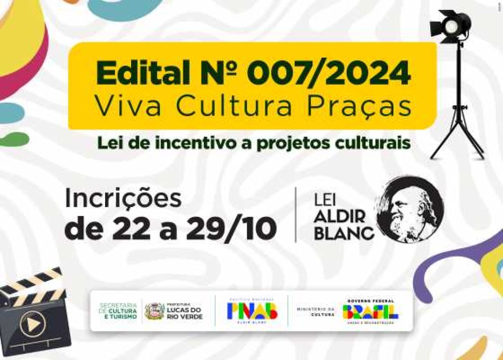 A Prefeitura de Lucas do Rio Verde, por meio da Secretaria de Cultura e Turismo, comunica que a partir desta quinta-feira (17), está disponível o Edital de Chamamento Público Nº 007/2024 “Viva Cultura – Praças”, que trata sobre a seleção de projetos para firmar termo de execução cultural com recursos da Política Nacional Aldir Blanc (PNAB), de fomento à cultura.