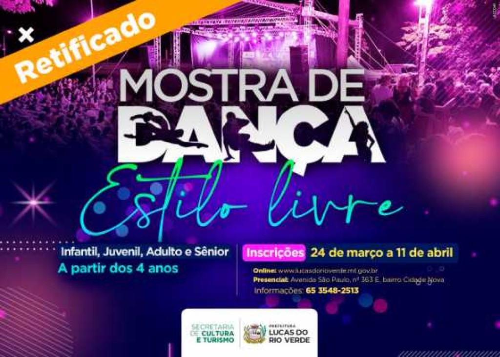 A Prefeitura de Lucas do Rio Verde, por meio da Secretaria de Cultura e Turismo, retificou nesta quarta-feira (26) o Edital nº 01/2025 do regulamento da Mostra de Dança 2025. No capítulo 3 das categorias, ao mencionar a categoria infantil, constou idade permitida dos 4 a 11 anos, quando deveria ser dos 4 a 12 anos.