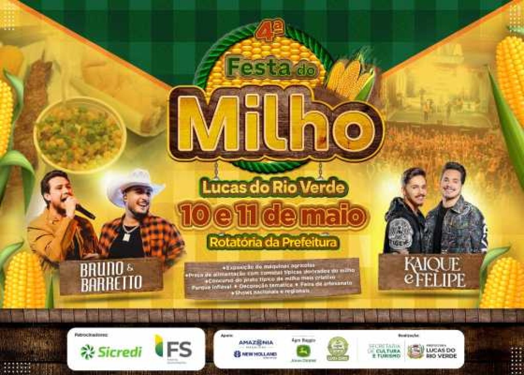 A 4ª edição da Festa do Milho promete movimentar Lucas do Rio Verde nos dias 10 e 11 de maio, com uma programação diversificada e gratuita para toda a comunidade luverdense. O evento será realizado na rotatória do Paço Municipal e contará com dois grandes shows nacionais: Kaique & Felipe no sábado e Bruno & Barretto no domingo.