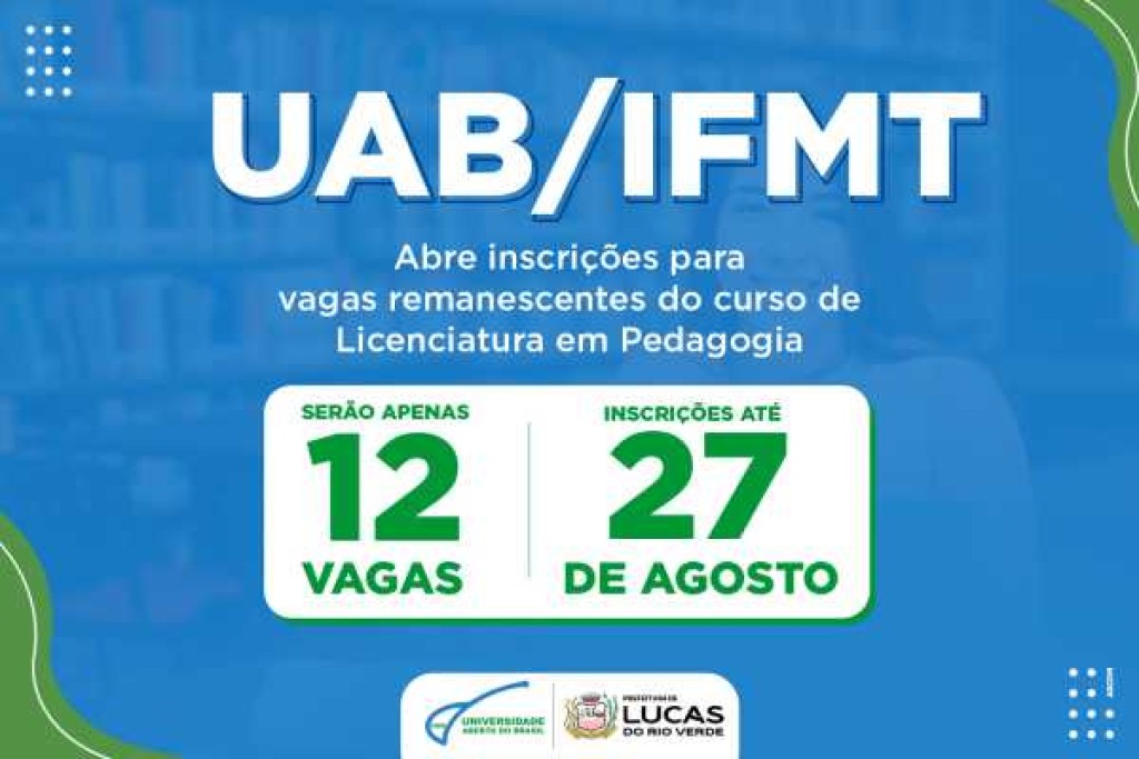 A Universidade Aberta do Brasil (UAB), polo de Lucas do Rio Verde, está ofertando 12 vagas remanescentes para o curso de Licenciatura em Pedagogia. O curso, ofertado pelo Instituto Federal de Mato Grosso – Campus Cuiabá, é gratuito e será realizado na modalidade de Educação a Distância (EaD).