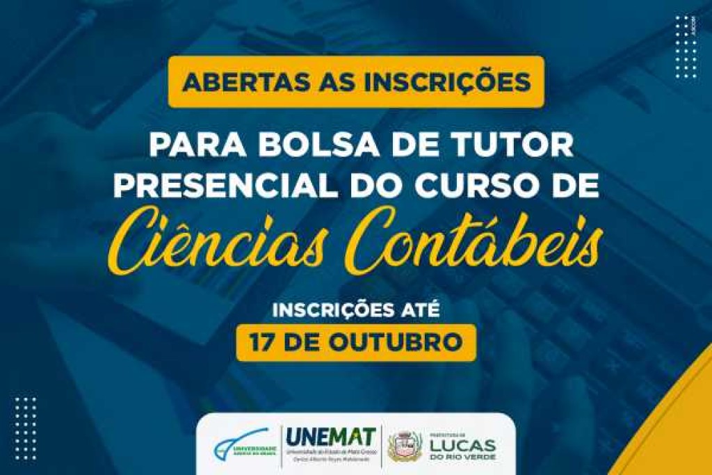 A Universidade Aberta do Brasil (UAB), polo de Lucas do Rio Verde, e a Universidade do Estado de Mato Grosso (Unemat) estão com inscrições abertas para o processo seletivo de bolsista para quem deseja atuar como tutor presencial no curso Bacharelado em Ciências Contábeis.