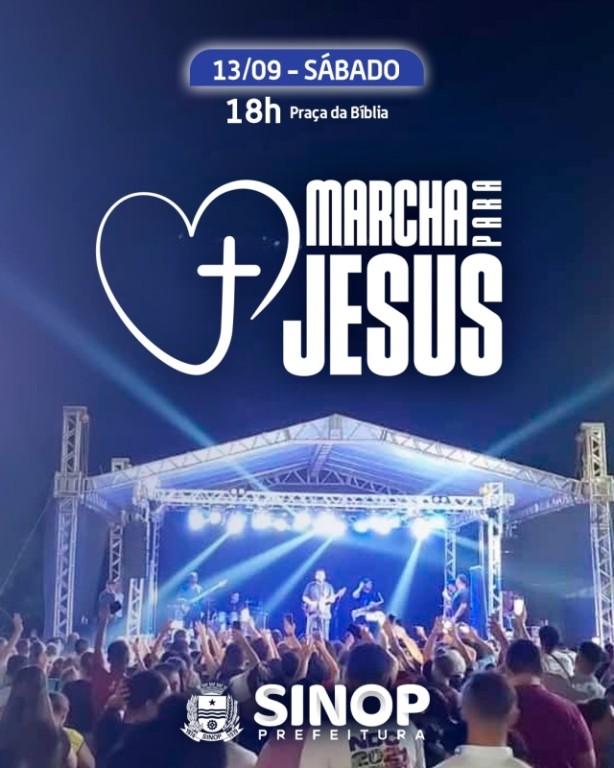 Organizada pela Prefeitura de Sinop, em parceria com a Ordem dos Ministros Evangélicos de Sinop (OMES), a Marcha para Jesus terá o trajeto pela Avenida dos Jacarandás. A chegada ao Gigante do Norte está prevista para após às 19h, quando os portões do estádio estarão abertos para o público. O evento é gratuito e faz parte dos últimos dias de programação do Festeja Sinop.