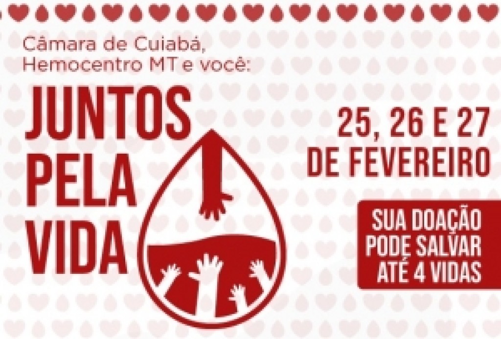 Nos dias 25, 26 e 27 de fevereiro, a Câmara Municipal de Cuiabá vai realizar  uma ação de doação de sangue em conjunto com o Hemocentro de Mato Grosso. Durante os três dias do projeto, a população cuiabana poderá ir até a Casa do Legislativo, onde um caminhão do Hemocentro estará das 8h às 17h realizando a coleta.