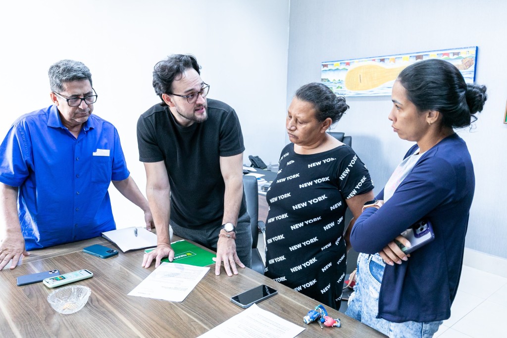 A foto ilustra o secretário de Governo, Ananias Filho, em uma sala que remete a um gabinete. Ele veste camisa azul e usa óculos. Ao seu lado, é possível visualizar outras três pessoas, todas conversando, com documentos sobre a mesa.
