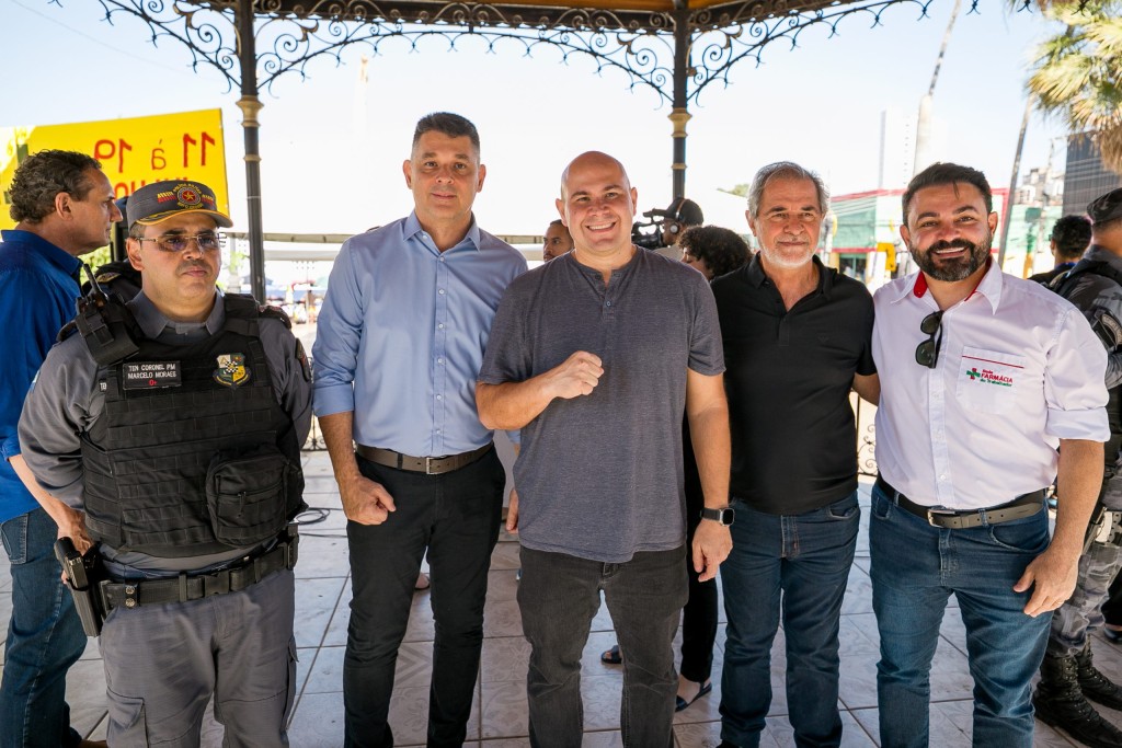 Na imagem principal, o prefeito está ao lado de representantes do comércio e da Polícia Militar. Todos estão no coreto da Praça Ipiranga e falam para as pessoas que transitam pelo centro sobre as ações de segurança.