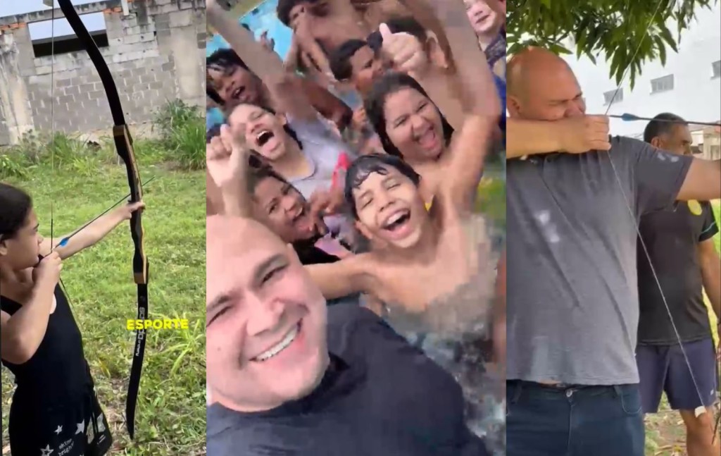 A foto mostra imagens do prefeito Abilio Brunini comando banho na piscina da Escola Municipal Maria Dimpina Lobo Duarte e praticando arco e flecha.