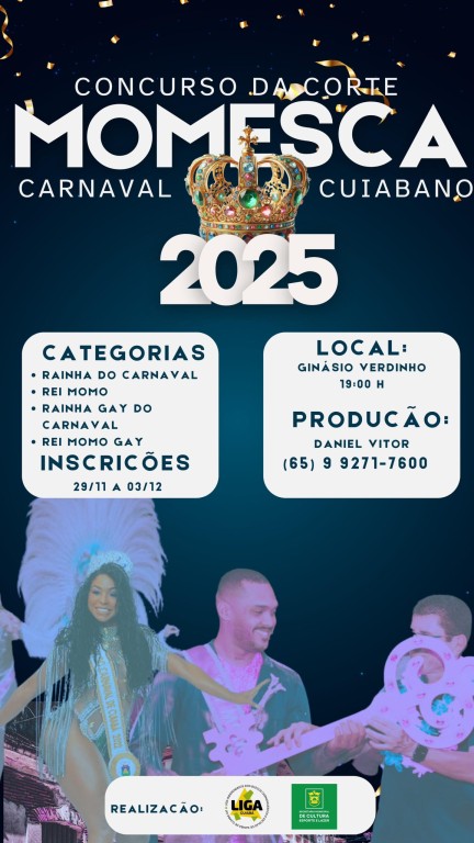 A Prefeitura de Cuiabá, por meio da Secretaria Municipal de Cultura, Esporte e Lazer juntamente com a Liga Independente de Blocos e Escolas de Samba de Cuiabá convida os interessados em participar do Concurso da escolha da Rainha do carnaval e, Momo do Carnaval de Cuiabá do ano de 2025 e Rainha do carnaval e Rei Momo LGBTQIA DE CUIABA 2025. As inscrições começam nesta sexta-feira (29) e seguirá até o dia 03 de dezembro, devendo ser realizadas de forma presencial, na sede da secretaria, das 08 às 11h das 14h às 16 horas, totalmente gratuita.