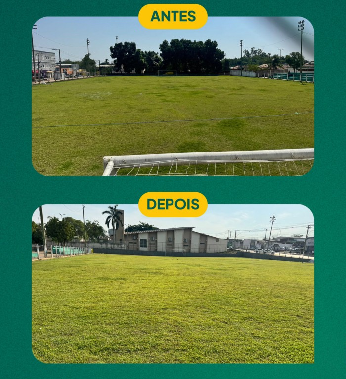 A imagem que acompanha a matéria mostra uma montagem com o antes e o depois de um campo de futebol revitalizado pela equipe da Secretaria Municipal de Esporte e Lazer (Smel). O comparativo evidencia as melhorias na manutenção do gramado e na conservação do espaço esportivo.