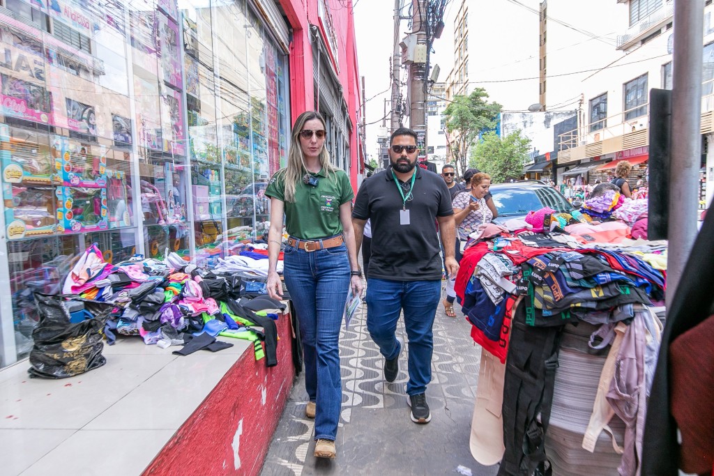 A foto mostra a secretária, Juliana Chiquito Palhares e o secretário de Turismo e Desenvolvimento Econômico, Fernando Medeiros, durante a ação para notificação dos comerciantes ambulantes na região central.