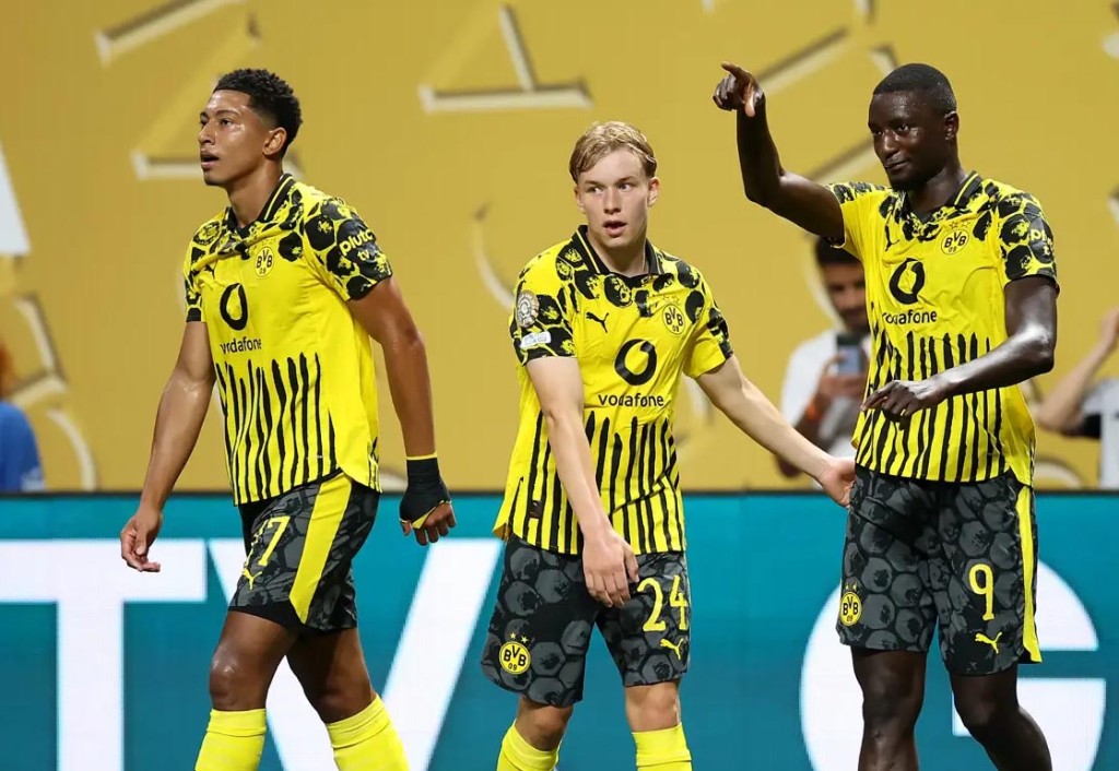 O Borussia Dortmund não demorou a mostrar seu poder ofensivo e abriu o placar logo aos 12 minutos do primeiro tempo. Em uma jogada rápida, Adeyemi recebeu um lançamento em profundidade pela ponta direita, ganhou na velocidade do marcador e cruzou na medida para Guirassy, que finalizou de primeira, sem chances para o goleiro, inaugurando o marcador.