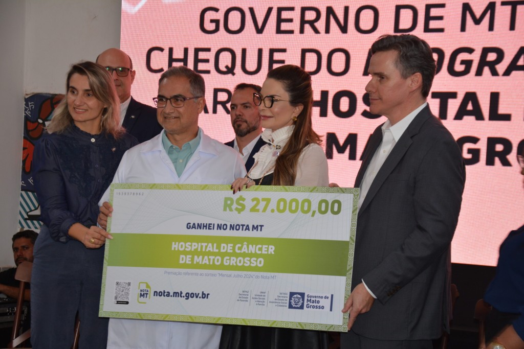 O Governo do Estado, por meio da Unidade de Ações Sociais e Atenção à Família (Unaf) e das secretarias de Fazenda (Sefaz) e de Assistência Social e Cidadania (Setasc), entregou, nesta quarta-feira (04.09), um cheque de R$ 27 mil do programa Nota MT ao Hospital de Câncer de Mato Grosso. O valor soma-se aos quase R$ 750 mil já recebidos pela instituição que há 25 anos atende os pacientes com câncer em todo o Estado.
