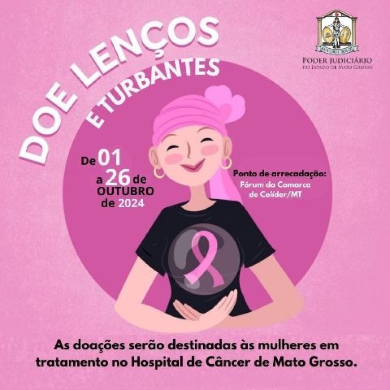 Garantir a qualidade de vida das mulheres em tratamento do câncer de mama pode ter impactos positivos na resposta ao tratamento. Diante disso, a Comarca de Colíder (a 632 Km de Cuiabá) realiza a 2ª edição da campanha “Doe Lenços e Turbantes”, até o dia 26 de outubro. Aqueles que desejam contribuir podem levar os acessórios até um dos pontos de coleta, disponíveis no Fórum de Colíder, instituições, espaços públicos e comércio local. As doações serão entregues ao Hospital de Câncer de Mato Grosso (HcanMT). Um levantamento prévio do HcanMT mostra que de janeiro até início do mês de outubro, 235 mulheres recebem atendimento para investigação, exame e/ou tratamento de mama. “Queremos reforçar a promoção do autocuidado e elevar a autoestima dessas mulheres”, destaca o diretor do Fórum, juiz Ricardo Frazon Menegucci.
