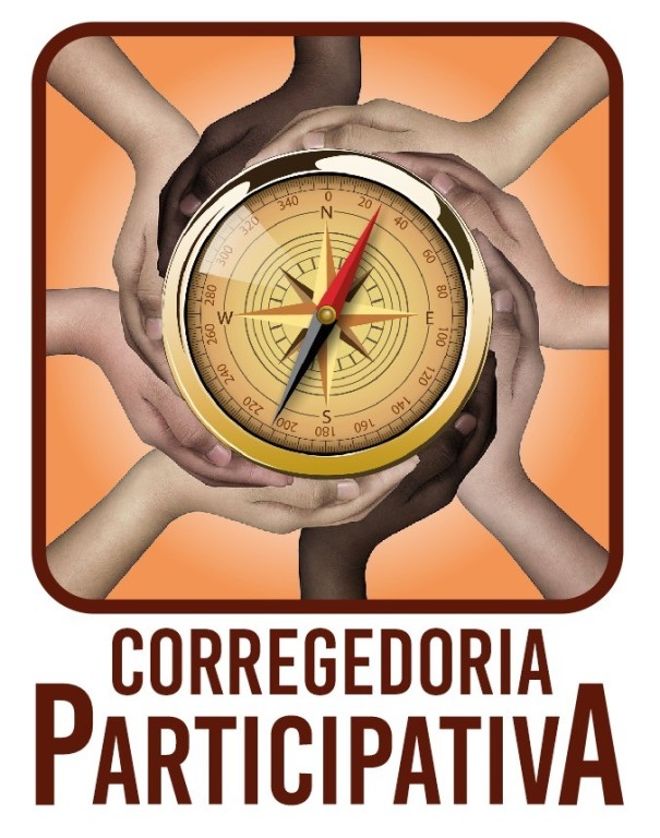#Paratodosverem. Esta matéria possui recursos de texto alternativo para inclusão das pessoas com deficiência visual. Descrição da imagem: Logo do Programa Corregedoria Participativa. A imagem tem uma bússola dourada ao centro, rodeada por mãos de diversas etnias.