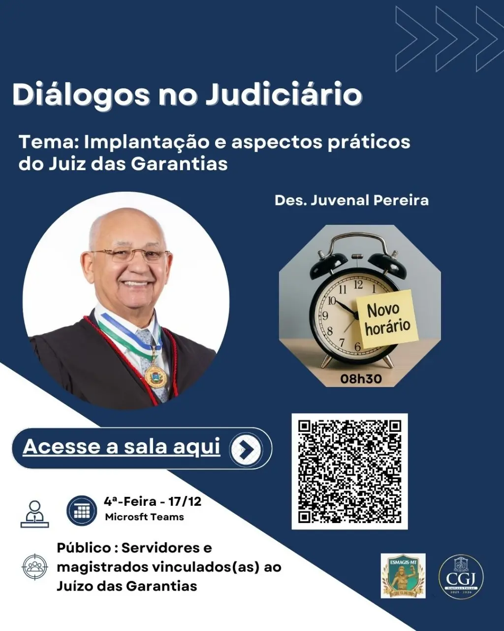 Em parceria com a Escola Superior da Magistratura e Escola dos Servidores, a Corregedoria-Geral da Justiça de Mato Grosso (CGJ-MT) promove na próxima quarta-feira (17 de dezembro), às 8h30, o terceiro ciclo do “Diálogos no Judiciário”. O expositor será o desembargador Juvenal Pereira da Silva, que vai falar sobre implantação e aspectos práticos do Juiz das Garantias.