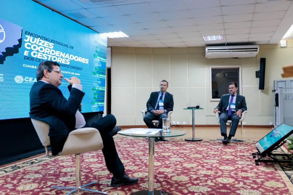 O ‘Encontro Estadual de Juízes Coordenadores e Gestores de Cejuscs de Mato Grosso’, realizado nos dias 29 e 30 de agosto, debateu e apresentou diversas boas práticas de mediação e conciliação desenvolvidas nos Centros Judiciários de Solução de Conflitos e Cidadania (Cejuscs) do Estado. O evento, realizado no Tribunal de Justiça de Mato Grosso, reuniu magistrados e gestores dos 48 Cejuscs instalados em todo o Estado. No primeiro dia do encontro, três painéis temáticos estavam na programação do evento, entre eles o painel ‘A efetividade da resolução de conflitos na saúde pública e o papel do juiz frente aos novos desafios envolvendo os conflitos da fazenda pública’. O painel temático teve como debatedor o desembargador José Luiz Lindote, e como expositores os magistrados Agamenon Alcântara, juiz coordenador do Cejusc da Saúde Pública, e Bruno D’Oliveira, juiz coordenador do Cejusc da Fazenda Pública.