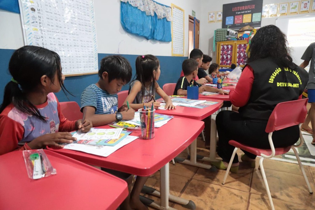 #Paratodosverem. Esta matéria possui recursos de texto alternativo para promover a inclusão das pessoas com deficiência visual. Descrição de imagem. Foto 1: A imagem mostra uma sala de aula com várias crianças indígenas sentadas em carteiras vermelhas. Eles estão envolvidos em atividades que envolvem desenhos e lápis de cor. Uma servidora do Detran-MT, vestindo um colete preto com texto amarelo nas costas, está sentada na ponta da mesa, interagindo com as crianças. Foto 2: A imagem mostra uma sala de aula com várias pessoas sentadas em carteiras dispostas em forma de U. Uma pessoa de camisa vermelha está no centro, segurando fitas coloridas. À esquerda, uma pessoa está sentada em uma mesa com um laptop e um projetor exibindo uma imagem. Foto 3: A imagem mostra um grupo de pessoas sentadas em círculo em uma sala com piso de azulejos. Existem aproximadamente 20 indivíduos, incluindo adultos e jovens. Algumas pessoas estão segurando papéis.