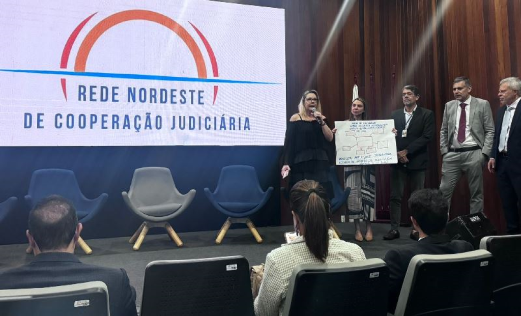 #Paratodosverem. Esta matéria possui recursos de texto alternativo para promover a inclusão das pessoas com deficiência visual. Descrição da imagem: foto em plano aberto que mostra duas magistradas e três magistrados, dentre elas a juíza Henriqueta Chaves, no palco de um auditório, durante uma apresentação para a plateia, que está sentada. A juíza Henriqueta Chaves segura um cartaz, enquanto sua colega fala ao microfone. No telão, a logo da Rede Nordeste de Cooperação Judiciária.