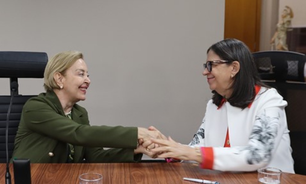 #Paratodosverem – Esta matéria possui recursos de texto alternativo para promover a inclusão das pessoas com deficiência visual. Descrição da imagem: no registro fotográfico, as presidentes do Tribunal de Justiça e do Tribunal Regional Eleitoral estão sentadas à mesa na solenidade de assinatura do Termo de Cooperação. As duas estão de frente uma para a outra, firmando o acordo com um aperto de mãos.