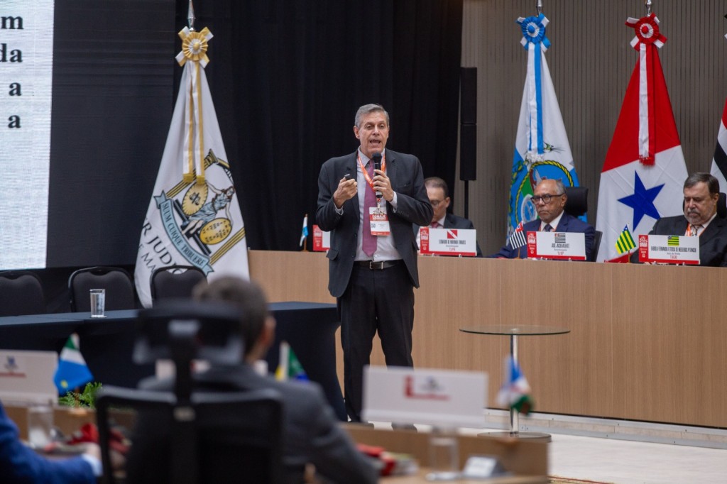 #ParaTodosVerem – Esta matéria possui recursos de texto alternativo para promover a inclusão das pessoas com deficiência visual. Imagem 1: a foto colorida mostra o desembargador palestrante falando ao microfone no centro do plenário. Ele é um homem de meia idade, alto, magro, cabelos grisalhos e olhos escuros. Está vestindo um terno cinza escuro, camisa branca e gravata rosa. Atrás dele é possível ver a bandeira do Judiciário e alguns participantes do evento.
