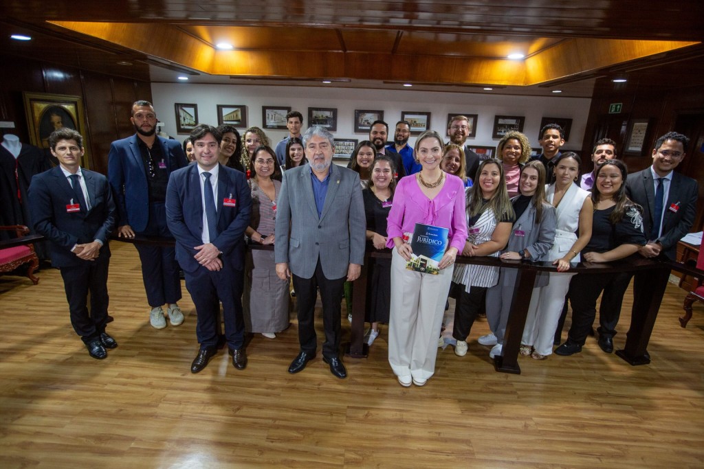 #Paratodosverem. Esta matéria possui recursos de texto alternativo para promover a inclusão de pessoas com deficiência visual. Descrição da imagem: Um grupo de pessoas está reunido em uma sala com piso de madeira. Na primeira fila, a advogada Xênia Guerra veste blusa rosa e calça branca e segura um livro. Ao lado dela, o desembargador Márcio Vidal de blazer azul claro está com as mãos entrelaçadas. Atrás deles, estão os 27 jovens advogados dispostos em fileiras, alguns vestindo ternos e outros em trajes casuais. A sala tem quadros emoldurados nas paredes e um teto com iluminação embutida.