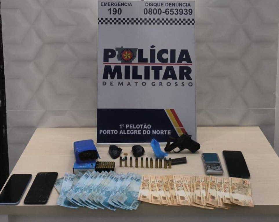 A Polícia Militar prendeu um homem, de 22 anos, por tráfico ilícito de drogas, na tarde desta segunda-feira (24.3), em Porto Alegre do Norte. Com o suspeito, foram apreendidas seis porções de drogas entre cocaína, maconha e pasta base. Além disso, uma pistola, 54 munições e uma quantia de R$ 2,6 mil em dinheiro também foram encontradas.