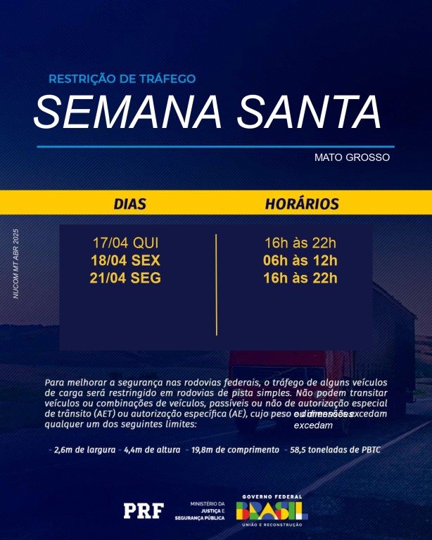 A Polícia Rodoviária Federal (PRF) iniciou, nesta quinta-feira (17), a Operação Semana Santa 2025, que seguirá até a segunda-feira (21), feriado de Tiradentes. A ação tem como principal objetivo garantir a segurança viária e a fluidez do tráfego nas rodovias federais que cortam o estado de Mato Grosso durante o feriado prolongado.