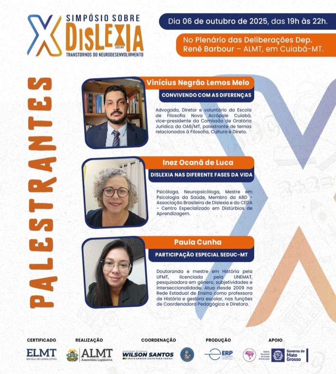 Em seguida, às 20h50, a psicóloga Inês Ocanã, da Associação Brasileira de Dislexia (ABD), falará sobre “Dislexia nas diferentes fases da vida”. A superintendente de Equidade e Inclusão da Secretaria Estadual de Educação (Seduc-MT), Paula Cunha, também participará do debate.