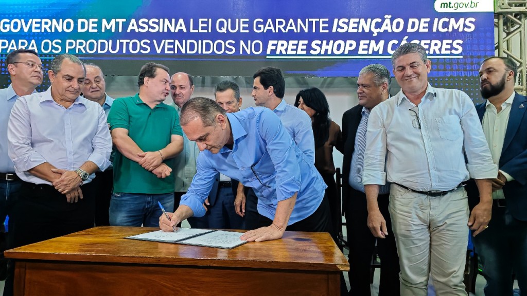 O deputado estadual Wilson Santos (PSD) participou, nesta quarta-feira (04), de um momento histórico para Mato Grosso com a assinatura da lei estadual que institui um regime tributário diferenciado para lojas francas (free shops) em cidades-gêmeas de municípios estrangeiros — como é o caso de Cáceres, que faz fronteira com a cidade boliviana de San Matías.