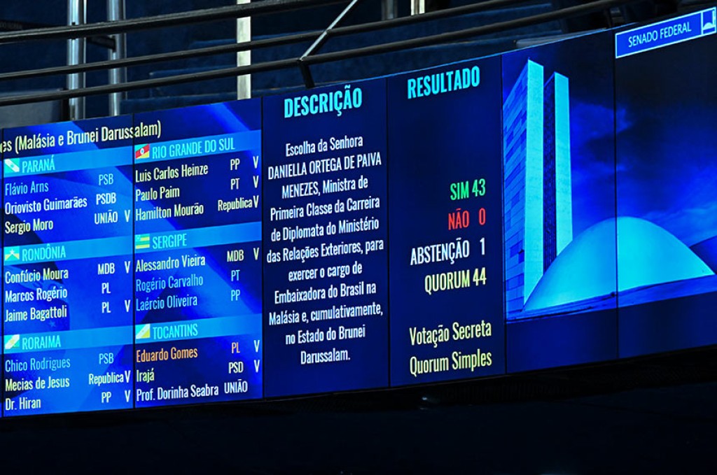 O Plenário do Senado aprovou a indicação de Daniella Ortega de Paiva Menezes para o cargo de embaixadora do Brasil na Malásia e, cumulativamente, em Brunei. A nomeação será efetivada pela Presidência da República, autora da indicação (MSF 17/2025). Foram 43 votos favoráveis e uma abstenção. A relatora foi a senadora Tereza Cristina (PP-MS).